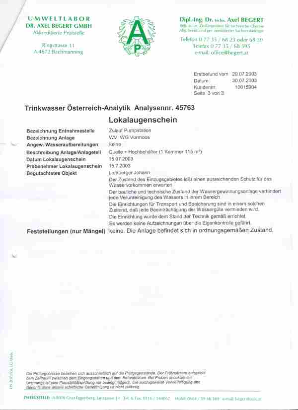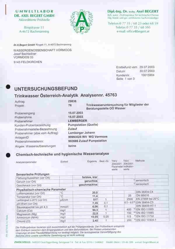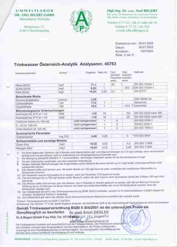 Trinkwasseruntersuchungsbefund 2003
