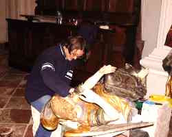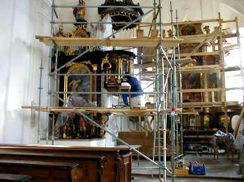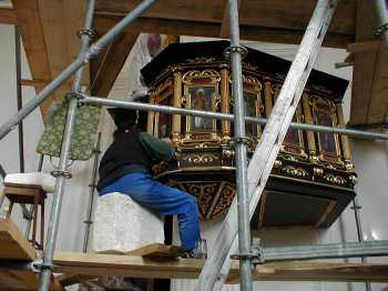 Endlich ist es so weit die Arbeiten zur Restaurierung des Hochaltars wurden in Angriff genommen. Der Hochaltar stammt aus dem Jahre 1755. Auf dem Altarbild von J. Gold aus dem Jahr 1881 wird die Steinigung des hl. Stephanus dargestellt. Dieser Auftrag wird von der Firma Moser-Seiberl aus Bad Aussee ausgeführt. Wie die mit der Arbeit beauftragten Restauratorinnen bestätigen, wird dies wohl längere Zeit in Anspruch nehmen. Dabei werden die Figuren und der Altar teilweise an Ort und Stelle und teilweise in der Werkstätte des Betriebes gereinigt, konserviert und falls notwendig neu vergoldet bzw. versilbert.