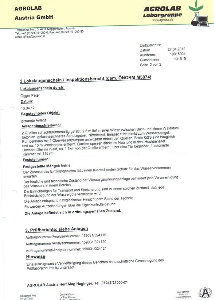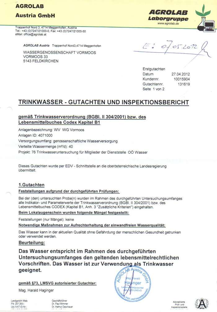 Trinkwasseruntersuchungsbefund 2012