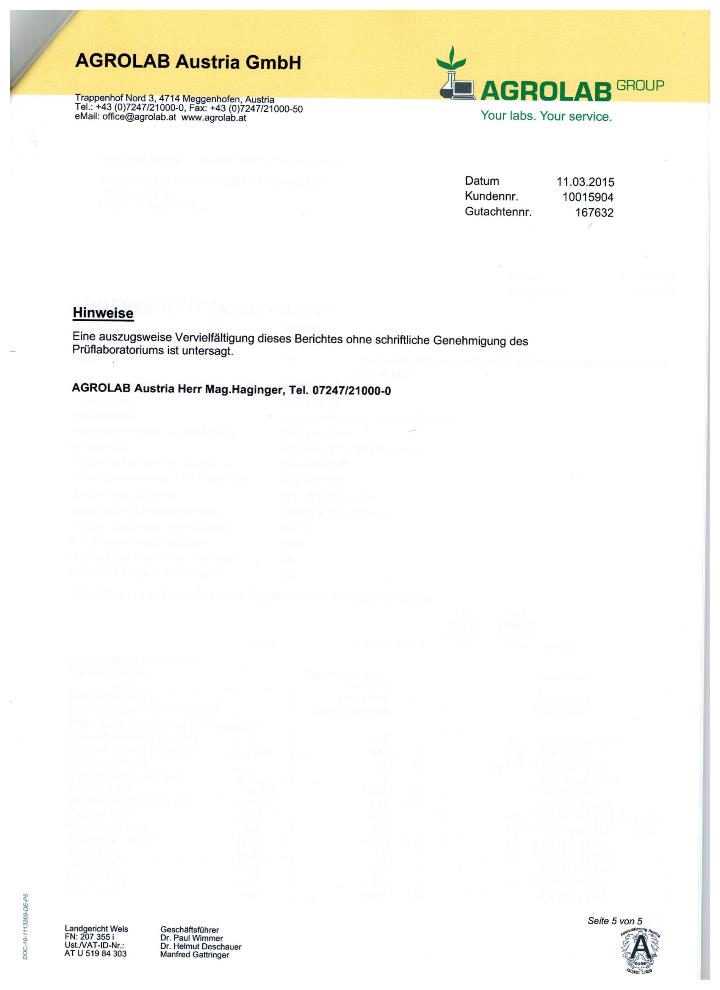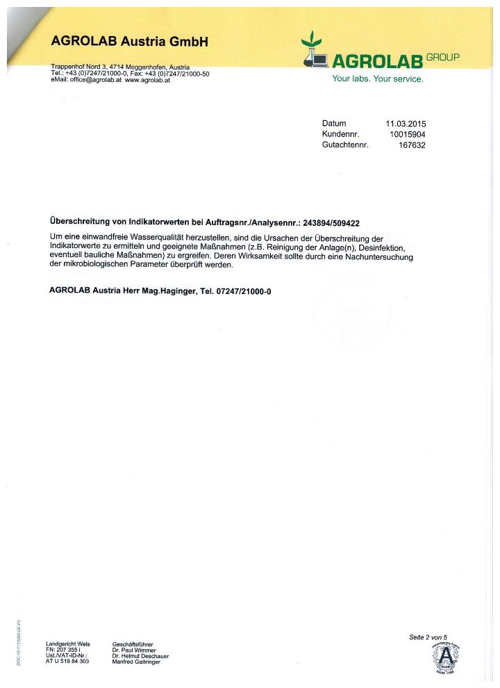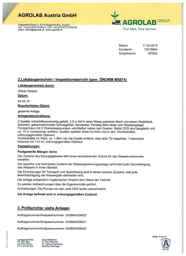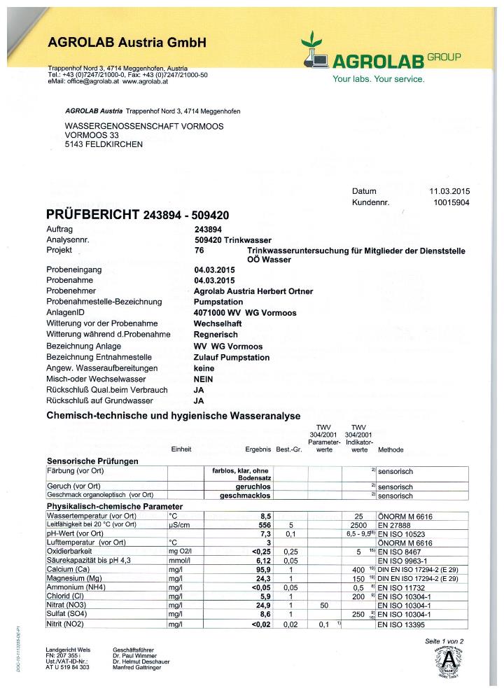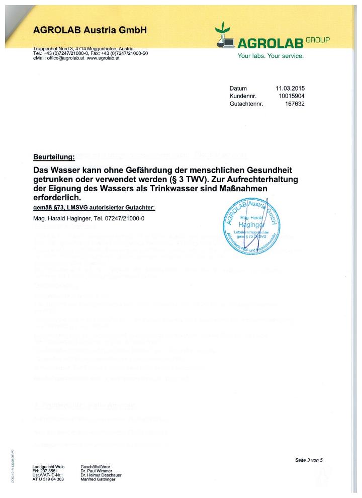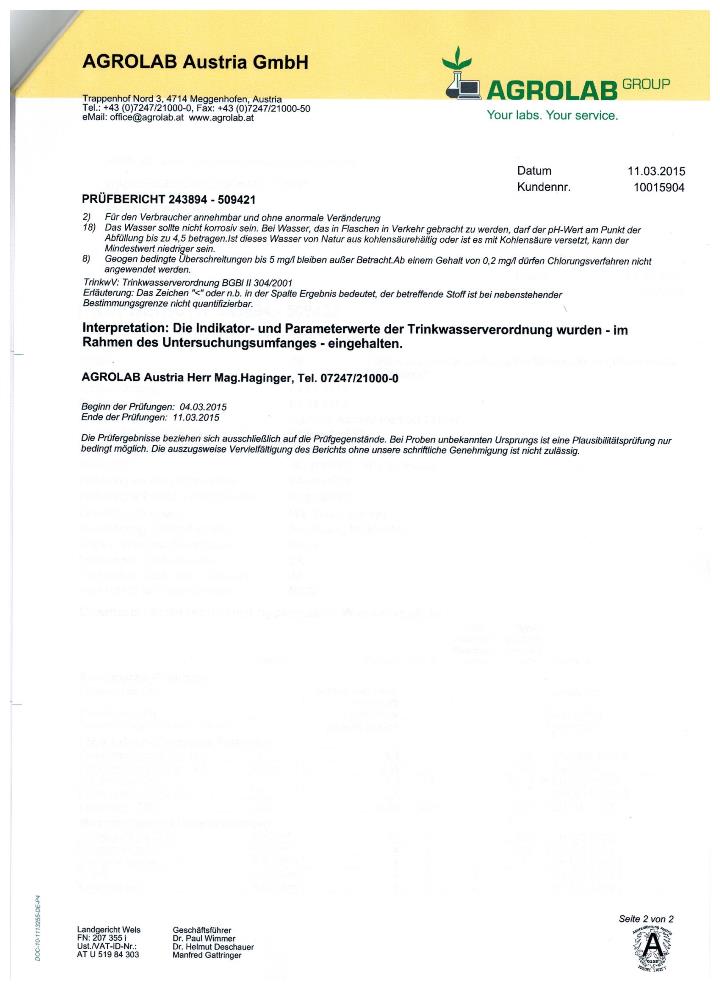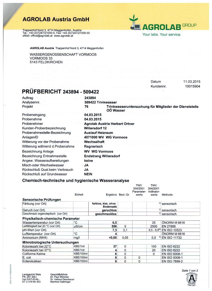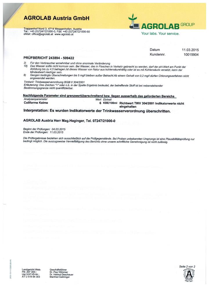 Trinkwasseruntersuchungsbefund 2015